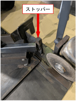 カット位置を決めるストッパーをつけています。毎回同じ位置で切断できるため、精度の安定につながっています。