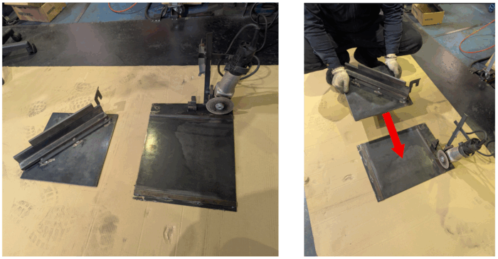 治具の構造としては、ベースの鉄板にガイドを溶接して、その上を45°で材料を固定できる型がスライドできるようにしています。